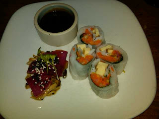 Fresh spring role with frilled tofu, carrots, jicama, watermelon radish, Thai basil, mint and rice noodles. Served with lime chili sauce, radish and grilled beech mushroom salad |